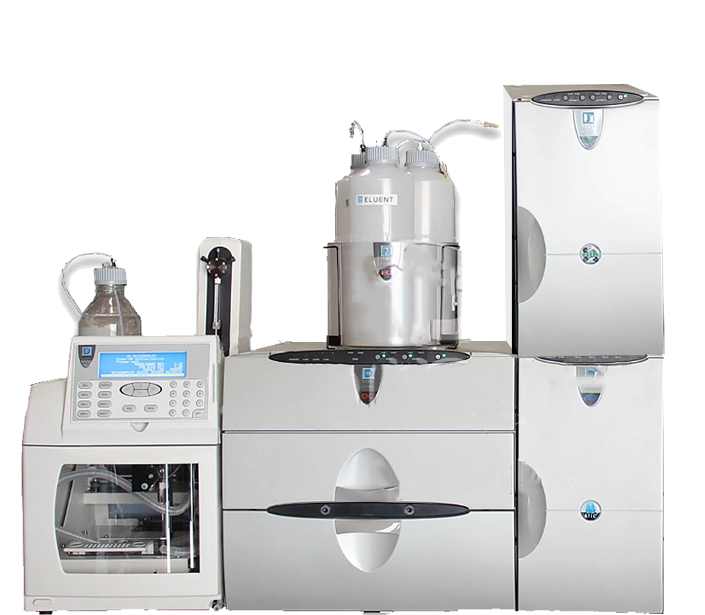 3. วิเคราะห์ Carbohydrate เช่น กลุ่มน้ำตาล glucose sucrose mannose xylose galactose หรือ polysaccharides โดยตัวอย่างจะถูกเตรียมในรูปของเหลว และนำเข้าเครื่อง อาศัยหลักการแตกตัวแลกเปลี่ยนประจุภายใน column และแยกสารทดสอบออกจาก column ตรวจวัดสาร Cation/Anion ด้วย Conductivity Detector ตรวจวัดสาร Corbohydrate ด้วย Electrochemical Detector