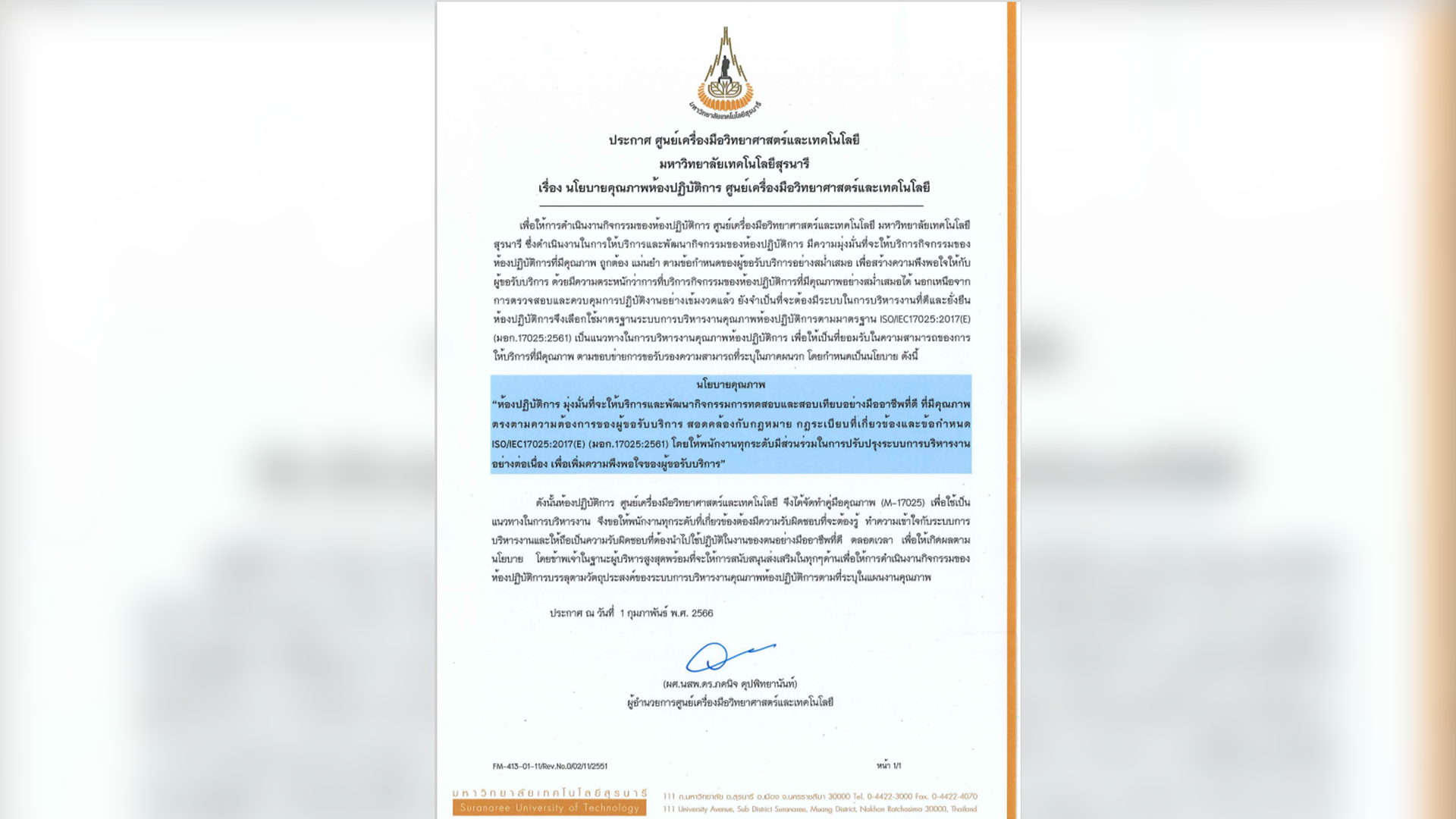 เรื่อง นโยบายคุณภาพห้องปฏิบัติการ ศูนย์เครื่องมือวิทยาศาสตร์และเทคโนโลยี