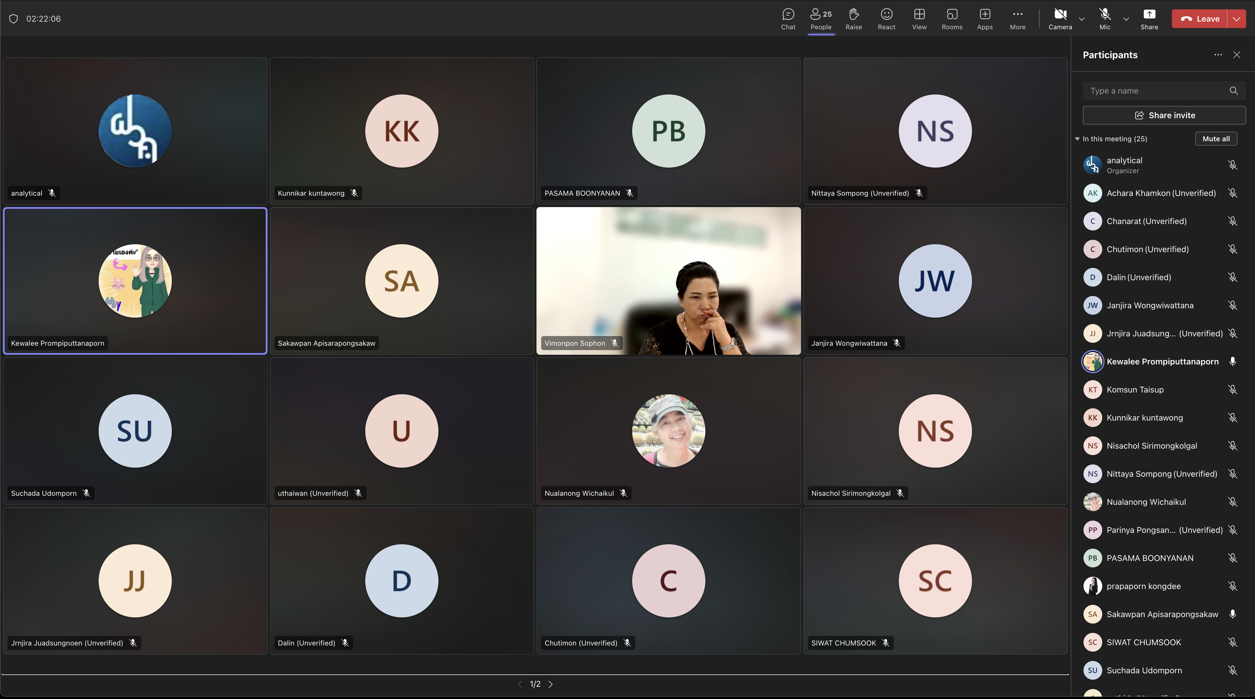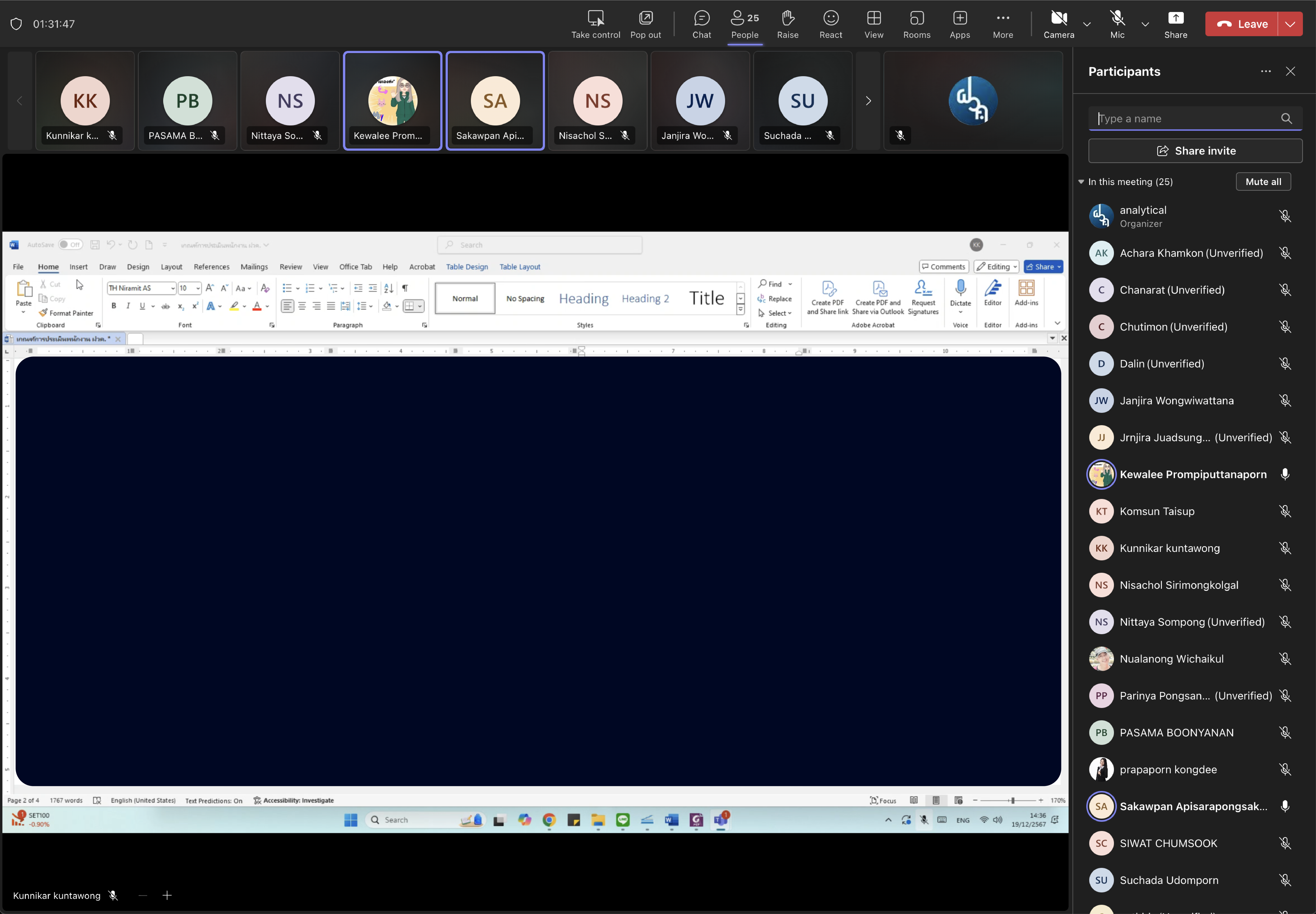 ฝ่ายวิเคราะห์ด้วยเครื่องมือ ได้มีประชุมหารือการดำเนินงานภายในฝ่ายวิเคราะห์ด้วยเครื่องมือ ในวันพฤหัสบดีที่ 19 ธันวาคม 2567 เวลา 13.30 - 16.00 น. ผ่านทาง Microsoft Teams นำโดย คุณสกาวพรรณ อภิสราพงศ์สกาว หัวหน้าฝ่ายวิเคราะห์ด้วยเครื่องมือ พร้อมหัวหน้างานและพนักงานในฝ่ายฯ ทั้งสิ้น 25 คน