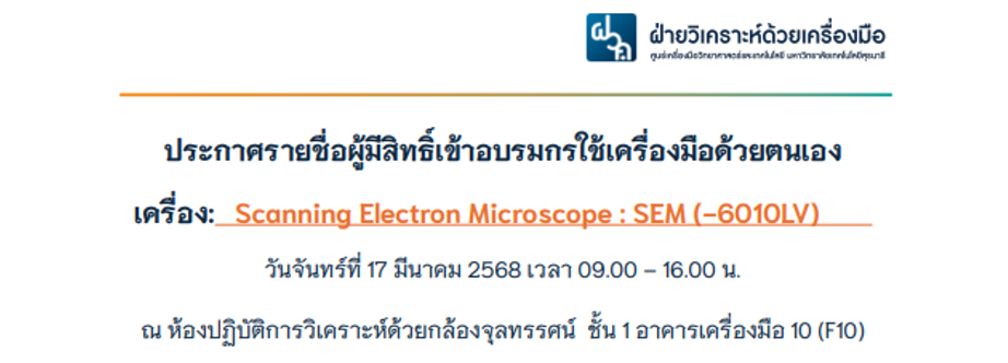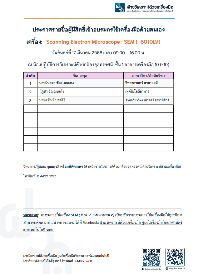หมายเหตุ: อบรมการใช้เครื่อง SEM (JEOL / JSM-6010LV) เปิดบริการอบรมการใช้เครื่องมือให้ทุกเดือนติดตามข่าวสารการอบรมได้ที่ ฝ่ายวิเคราะห์ด้วยเครื่องมือ ศูนย์เครื่องมือวิทยาศาสตร์และเทคโนโลยี มทส.