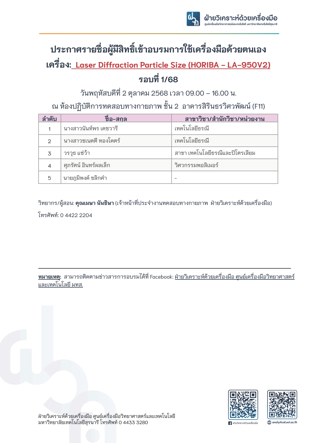 Facebook: ฝ่ายวิเคราะห์ด้วยเครื่องมือ ศูนย์เครื่องมือวิทยาศาสตร์และเทคโนโลยี มทส.